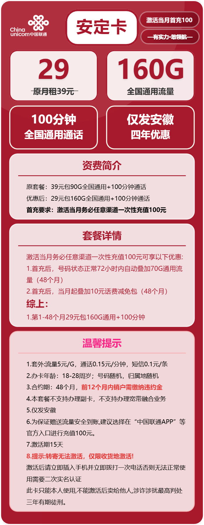 - 优惠后:29元包160G全国通用+100分钟通话