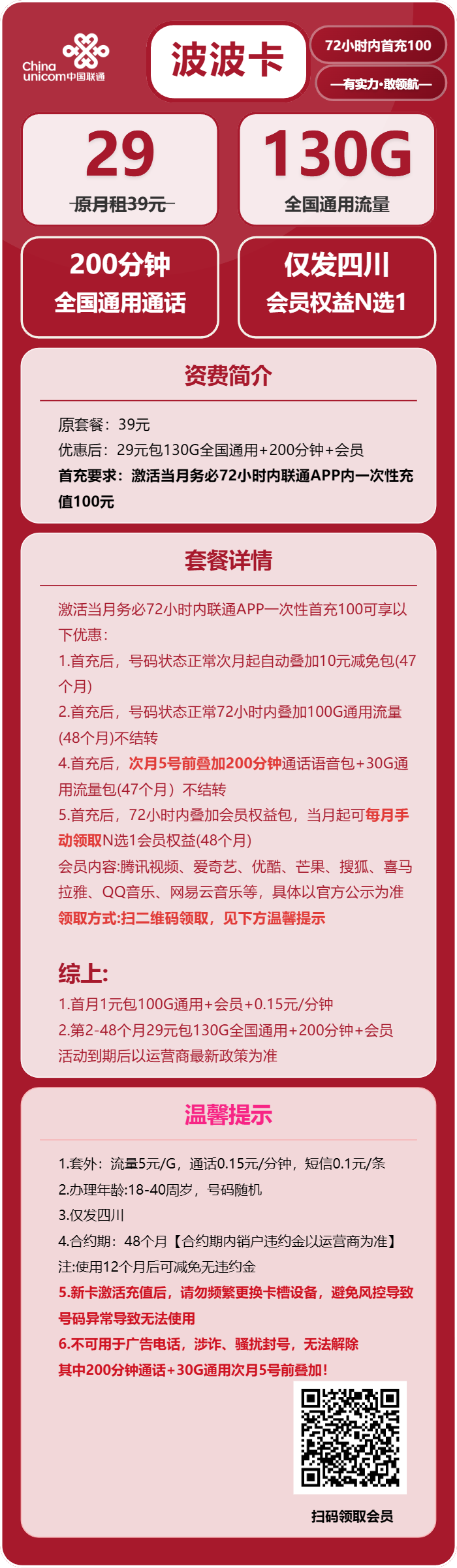 🎉四川18-30岁的宝子们看过来!专属福利炸场啦🔥 每月仅需29元=130G通用流量+200分钟通话+会员权益! 流量刷剧打游戏管够,通话也不用愁😎 这羊毛不薅血亏! 📢重要提醒: ✅仅限18-30周岁四川小伙伴 ✅快递员上门激活,省心省力 ✅激活后72小时内,务必在联通APP一次性首充100元 ✅合约期48个月,理性上车哦~ 归属地四川,不支持选号,配送随机~ 心动的宝子速戳我了解详情👉💬 手慢无! #四川联通福利 #年轻人专属套餐 #流量自由不是梦 (表情可以根据喜好调整,比如加🍟🍿代表刷剧零食搭档,让文案更生动~) 例如: 🎉四川18-30岁的宝子集合!联通波波卡来宠你啦🍟 29元/月=130G通用流量+200分钟通话+会员! 刷剧打游戏流量管够,通话唠嗑也自由😎 📢注意事项: ▪️仅18-30岁四川用户可冲 ▪️快递上门激活,超方便 ▪️激活72h内联通APP首充100元(一次性) ▪️合约48个月,想好再上车哦~ 归属地四川,不选号,配送随机~ 需要的宝子滴滴我👉💬 错过拍大腿! 这样既突出优惠,又讲清规则,活泼又实用~😉