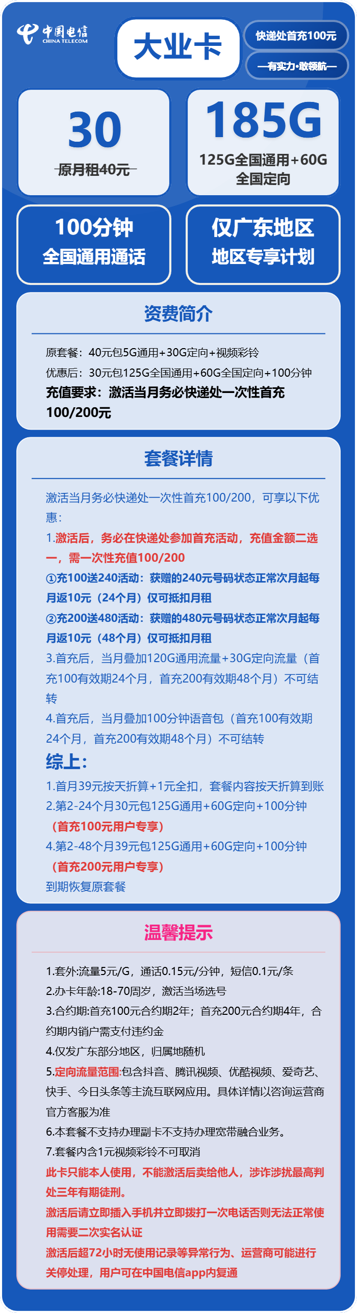 - 2.第2-24个月30元包125G通用+60G定向+100分钟(首充100元用户专享)4.第2-48个月39元包125G通用+60G定向+100分钟(首充200元用户专享)到期恢复原套餐