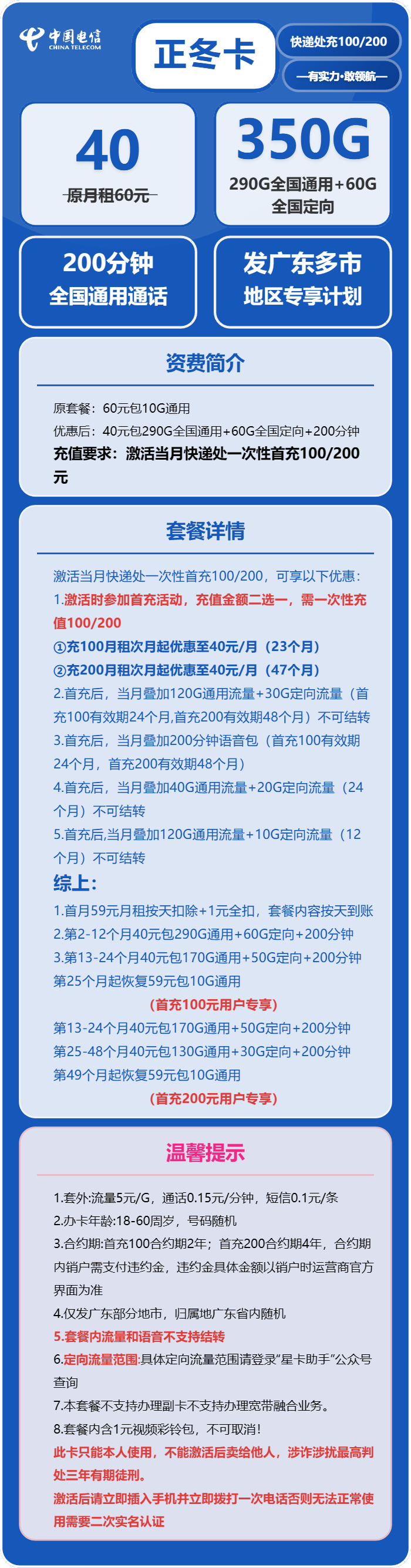 📣广东的宝子们看过来!电信这波王炸套餐我先冲为敬~🎉 40块钱=290G通用流量+60G定向流量+200分钟通话!! 这流量池直接给我干到“用不完根本用不完”的程度💦 刷剧/打游戏/视频通话,全家共享都不带心疼的~ ✅广东专属!线下直接派送上门 ✅快递小哥带着卡来帮你激活,不用跑营业厅超方便📦 ✅18-65岁都能办,爸妈/打工人/学生党都适配👨👩👧👦 ⚠️激活当月记得强充100(合约2年)/200(合约4年) 长期用的话这价格香到离谱!不选号直接发,省内通用无压力~ 复机打10000或者电信APP就能搞定,超省心~ 这波羊毛不薅真的亏!需要的宝子速戳我预留名额👇 手慢的宝可能就没啦~冲鸭!💨 (配图:流量明细截图+快递上门激活示意图更直观哦~)