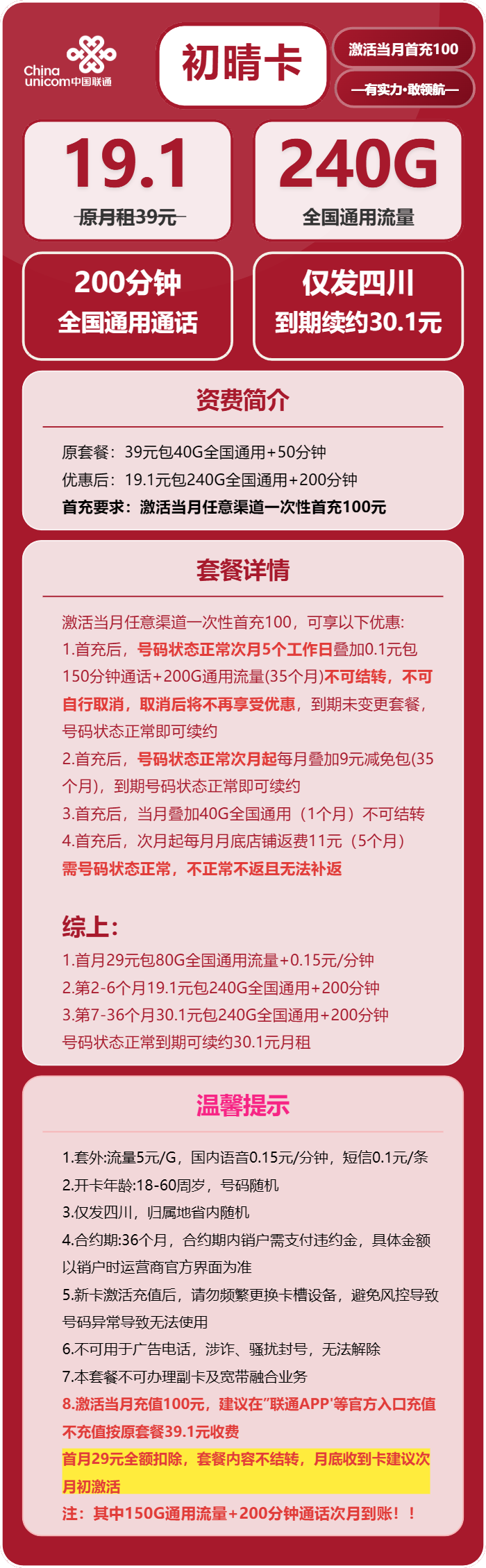 联通初晴卡是中国联通官方推出的高性价比流量卡,官方运营商手机卡,非物联卡。中国联通APP可查套餐。低资费,超大流量!正规联通手机卡,可共享热点流量。注意:此卡仅发四川。免费包邮到家,随时下架。