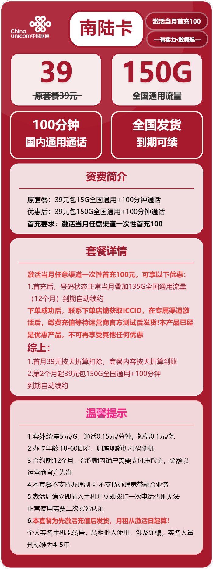 - 优惠后:39元包150G全国通用+100分钟通话