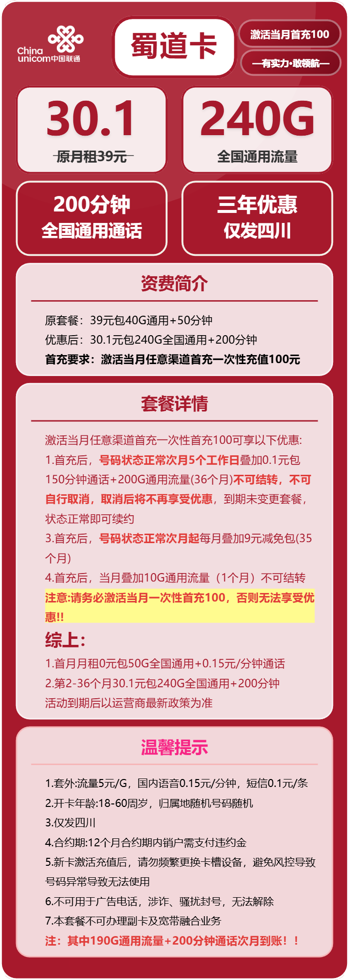 - 优惠后:30.1元包240G全国通用+200分钟