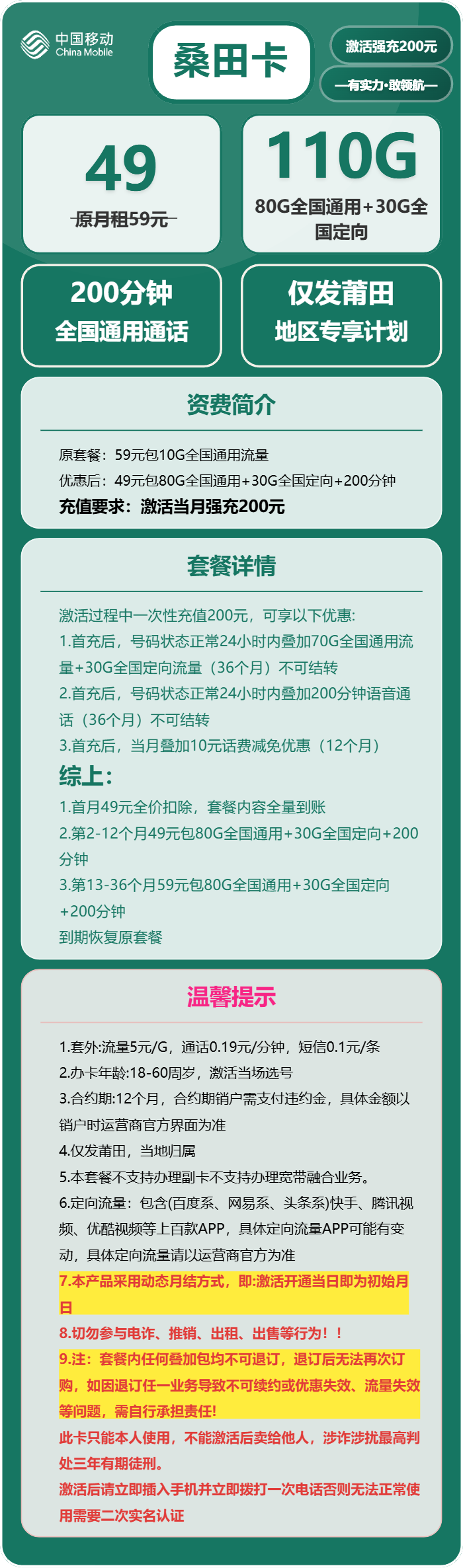移动桑田卡是中国移动官方推出的高性价比流量卡,官方运营商手机卡,非物联卡。中国移动APP可查套餐。低资费,超大流量!正规移动手机卡,可共享热点流量。免费包邮到家,随时下架。